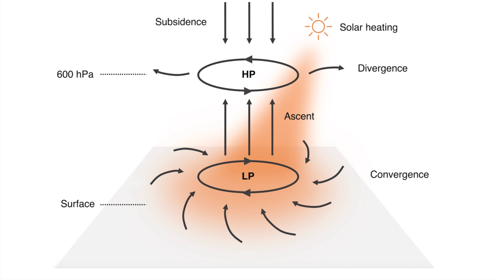 The Kalahari Heat Low is a feature of the lower atmospheric circulation that forms over the Kalahari Desert in austral summer (Attwood et al., 2024). Heat lows, or thermal lows, are key features of subtropical, desert climates, where intense solar heating driving dry, shallow convection causes a low-pressure system to develop (Rácz and Smith, 1999). As the surface heats up, air rises and the surface pressure decreases, generating convergence and cyclonic circulation at the surface (Figure 1). Above the heat low and beneath upper-level subsidence, a high-pressure system forms. In southern Africa this feature is the Botswana High (Driver and Reason, 2017). This keeps skies cloud-free, maintaining high surface solar radiation and acting as a cap on the dry convection associated with the heat low.